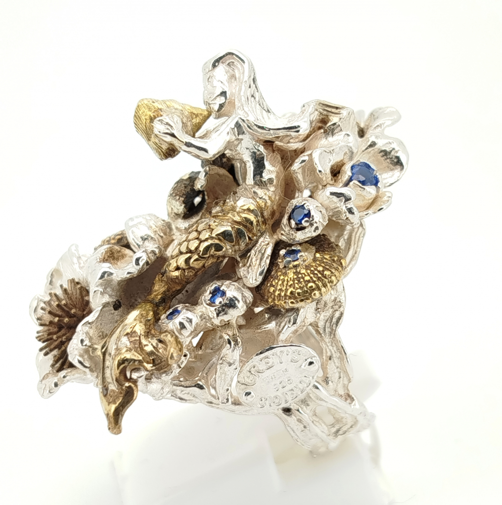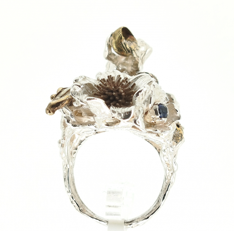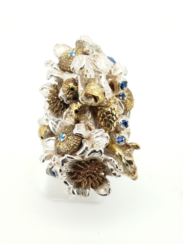 Anello in argento 925/1000 con inserti in ottone , zirconi. Misure superficie 2.5x 4 cm, alto 2.2 cm. Misura anello 13, personalizzabile su richiesta.