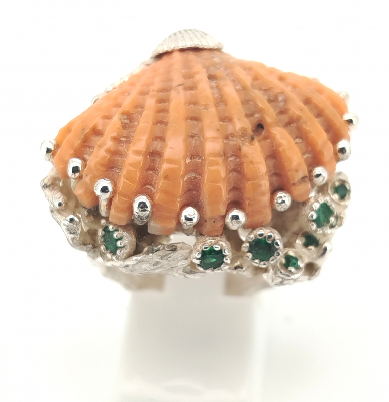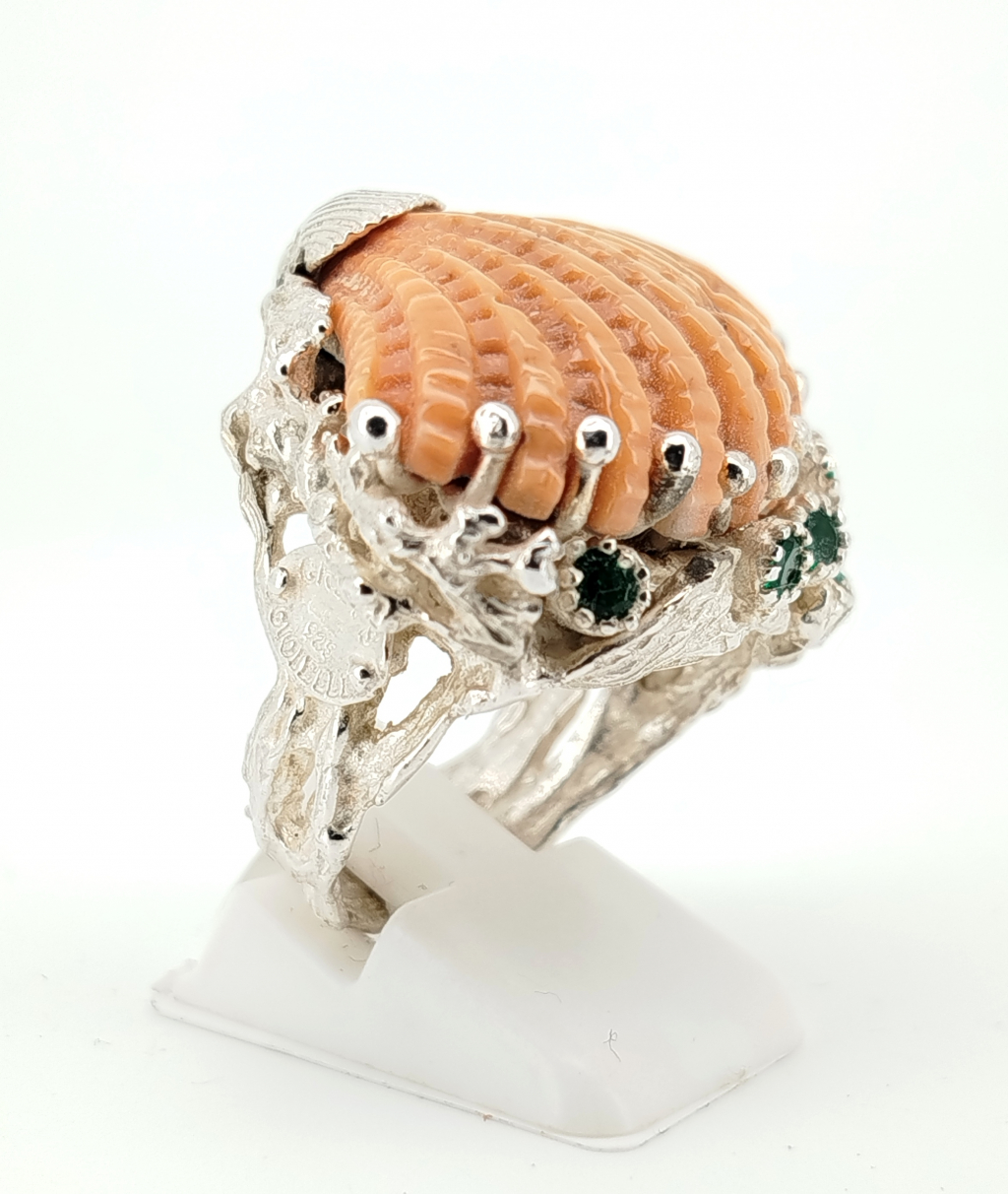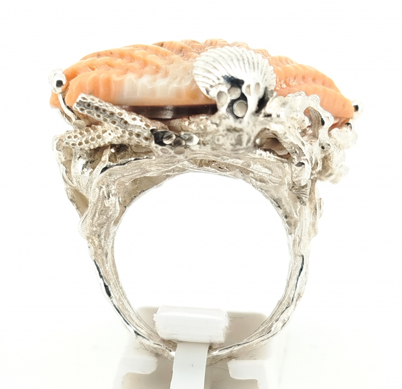 Anello in argento 925/1000 , scultura di conchiglia in corallo naturale