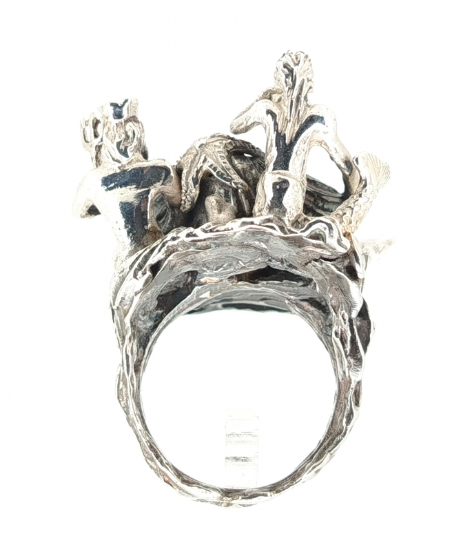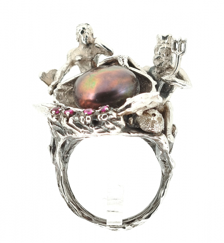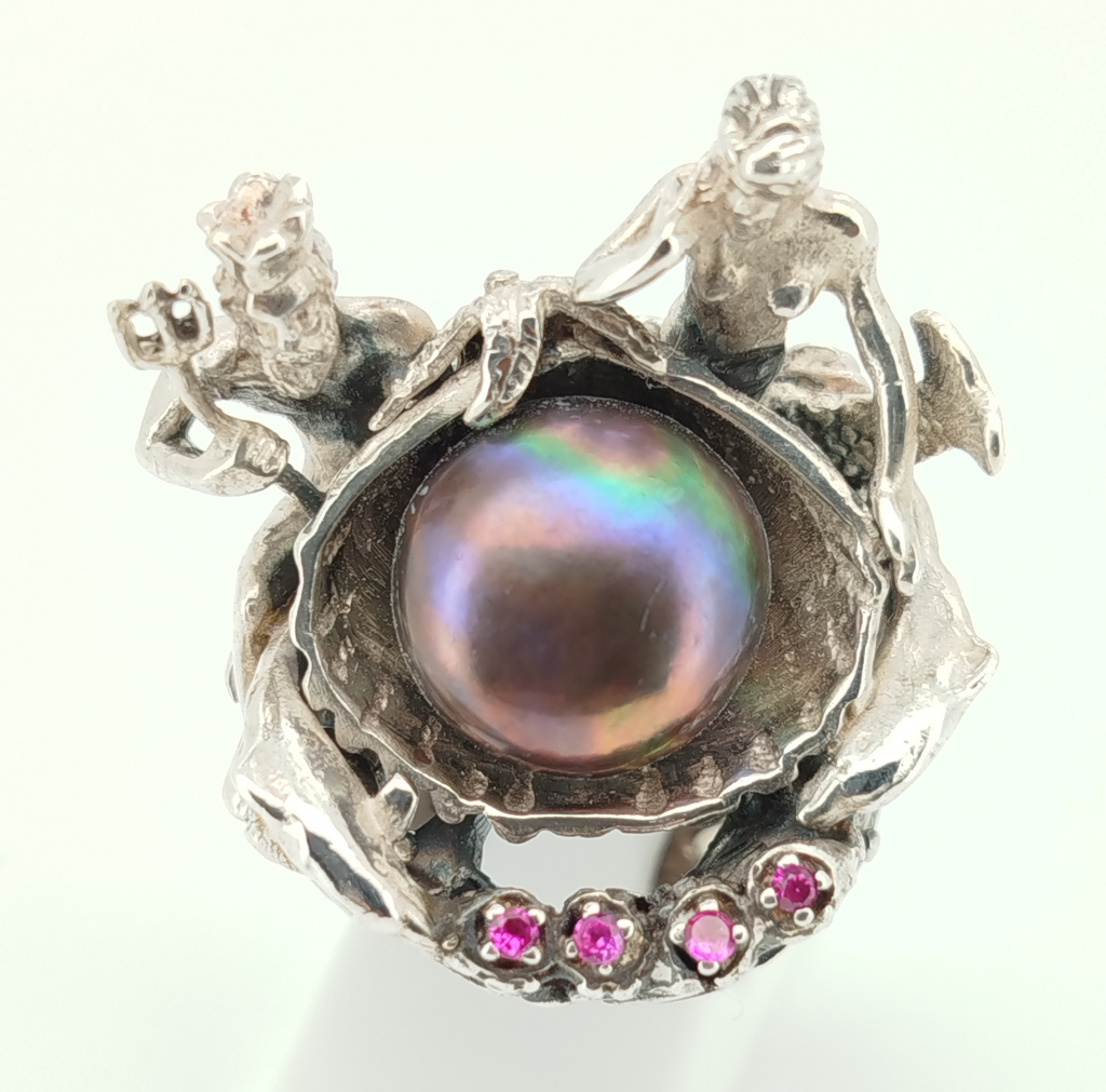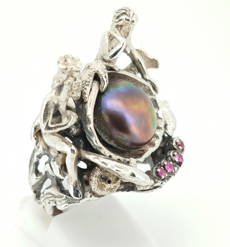 Anello in argento 925/1000, zirconi, perla coltivata. Misure superficie 2.5x2.5 cm, alto 1.5 cm. Misura anello 12-13, personalizzabile su richiesta.