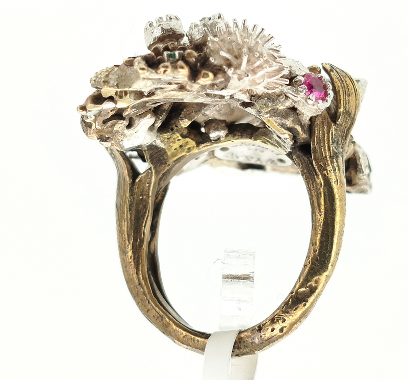 Anello in ottone ed argento 925/1000, zirconi. Misura superficie2.7x 4.2 cm, alto 0.7 cm. Misura anello 15-16, personalizzabile su richiesta .